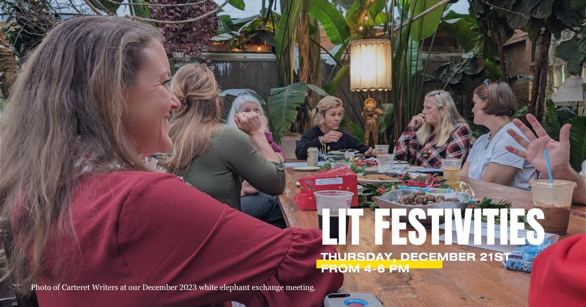 Let's celebrate a year of writing together December 18th from 4-6pm at Clawson's Restaurant on the Beaufort waterfront. We will be in the private back room, with a community poem activity and a white elephant gift exchange. Bring a WRAPPED BOOK to give, and receive one in return! We will be able to order food