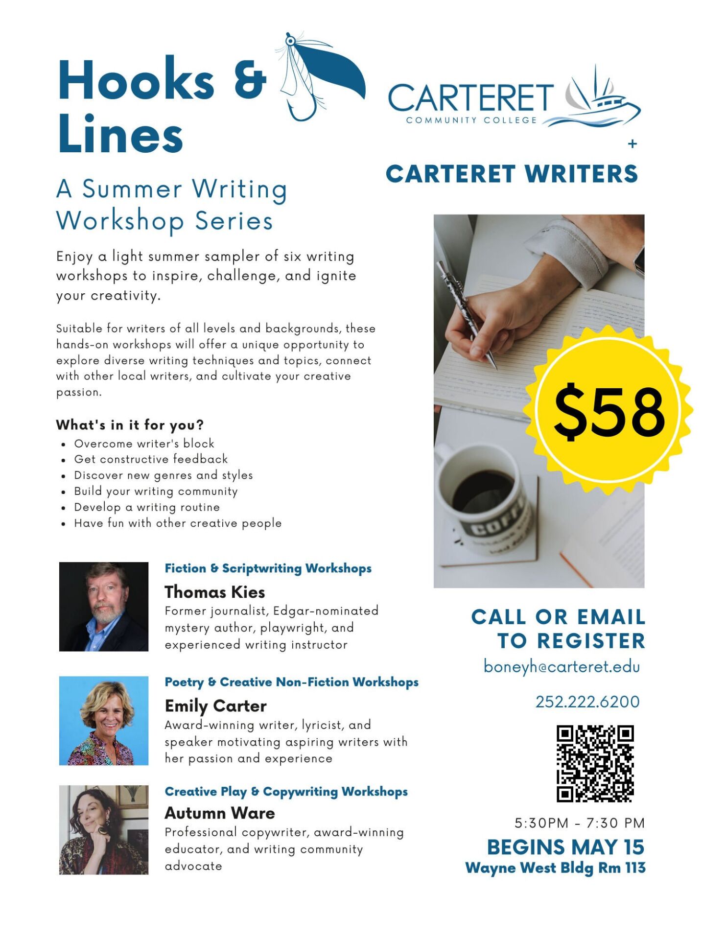 We’re late to the blog party this week, but that’s because the whole board is still recovering from the absolute euphoria that was our Quadrennial Conference. If you weren’t able to make it, we’ll be providing a recap in the coming weeks. I promise. However, for now, I’m stealing this slot in our still young and malleable editorial calendar to slip in a shameless plug for our latest offering: Hooks & Lines, a summer writing workshop series developed in partnership with Carteret Community College.